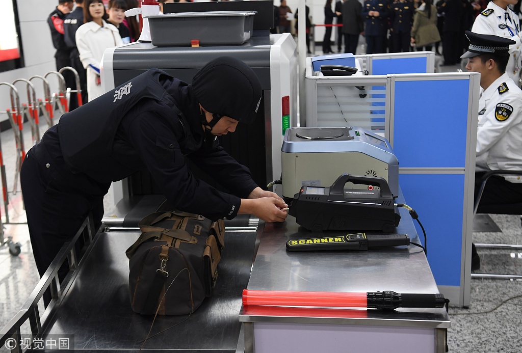 A security staff member checks a suspicious package during an explosive detection drill at a metro station in Changchun, Northeast China’s Jilin province, Oct 14, 2017.[Photo/VCG]