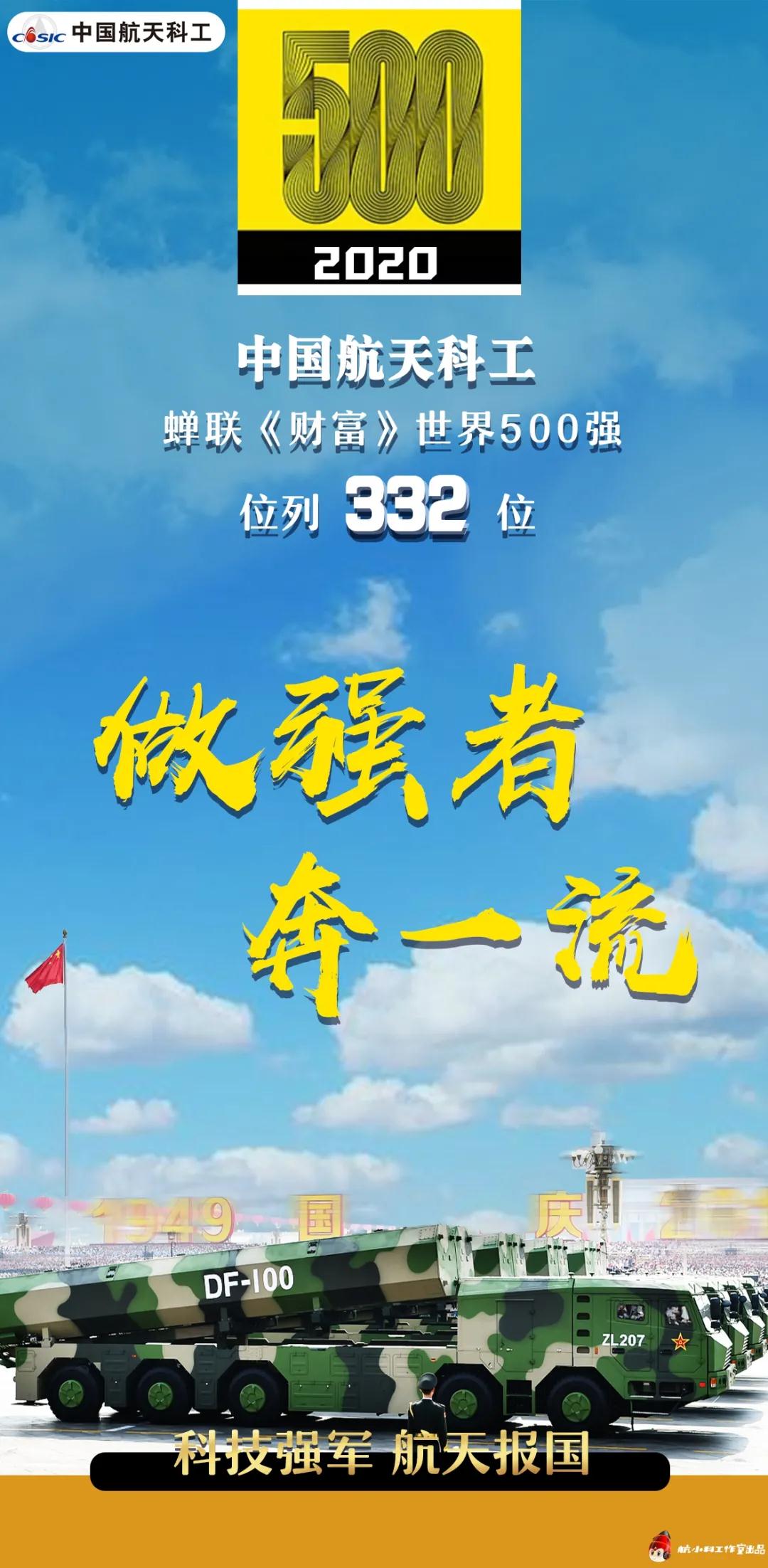 On August 10, the Fortune Global 500 list of 2020 was released. CASIC has appeared on the listed for five consecutive years, ranking 332nd this year.