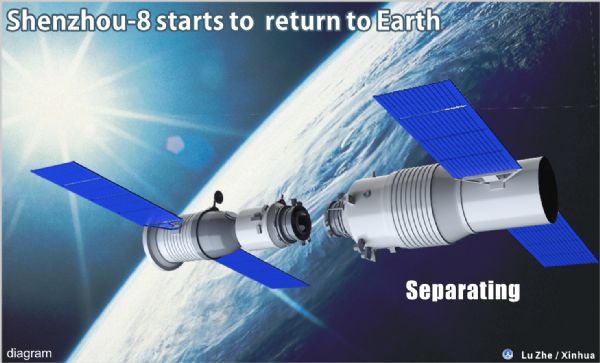 The re-entry capsule of Shenzhou-8 is set to land back on earth around 7 p.m. Thursday, the spokesperson said, adding that all arrangements are in place for the search and rescue of the re-entry capsule after it lands.