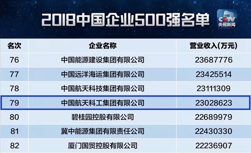 On the Summit Forum of Top 500 Chinese Enterprises held on September 2, 2018, China Enterprise Confederation/China Enterprise Directors Association published the list of “Top 500 Chinese Enterprises”. With an operation revenue of RMB 230.28623 billion, CASIC is ranked the 79th in the top 500 Chinese enterprises in 2018.